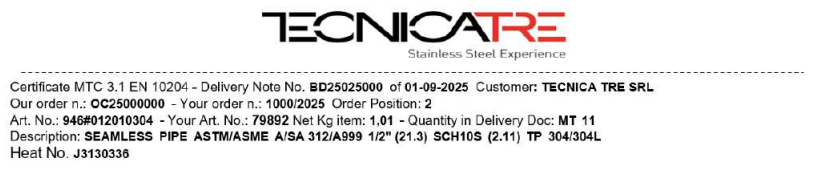 Nel nostro percorso di miglioramento continuo, Tecnica Tre ha introdotto a partire dal 1° settembre 2025 una nuova funzionalità pensata per rendere più semplice e trasparente la gestione dei documenti. Tutti i Certificati Produttori (3.1 MTC EN 10204) non verranno inviati più come semplice scansione del documento ma ogni articolo-colata idoneo alla fornitura di tale certificazione riporterà, nella testata del documento, una serie di informazioni utili quali: